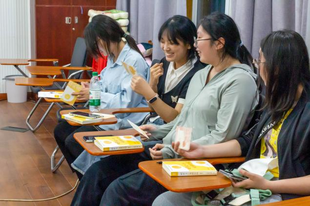 活动现场设置多维度体验环节,引领参与者走进文字构建的治愈世界。“我们要如何在快节奏的生活中守护内心童真呢?”领读员王天恩结合生活实例,简要解读了书中潜藏的哲理,引发同学们深度思考。书页翻动声与窗外微风交织,同学们在油墨清香中卸下压力,与书中的蛋黄君共赴心灵之旅。