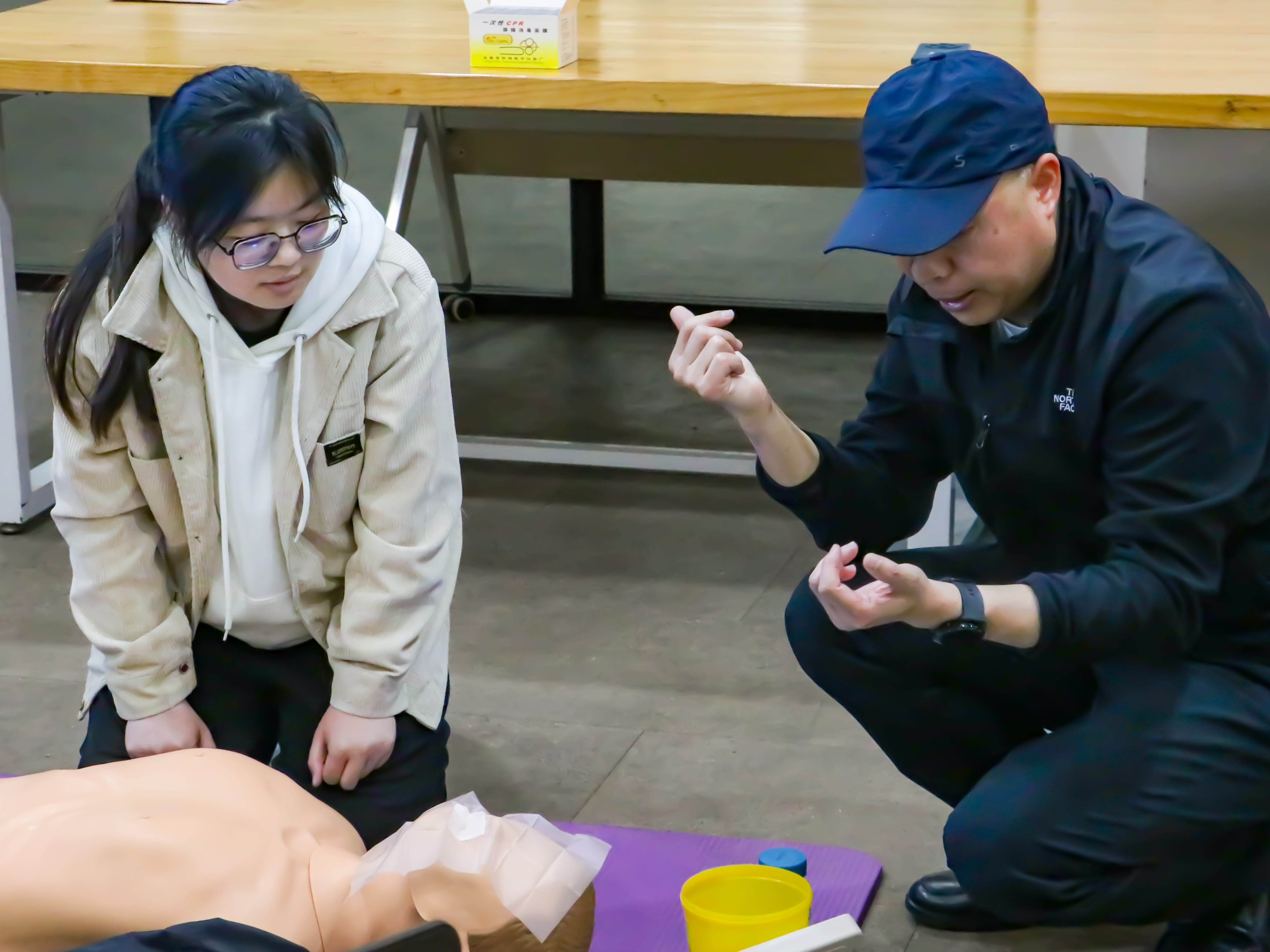 在实操环节中,同学们被分为两组,袁诚信和王锋一一指导。同学们在教学模拟人逐一进行胸外按压、人工呼吸、开放气道及AED操作的练习,老师在旁边纠正动作,保障操作流程的正确、规范。每当模拟人发出“急救成功”的提示音时,现场总会响起热烈掌声,这不仅是对同伴规范操作的认可,更是对生命的敬畏与礼赞。2025级翻译专业的金吉喆分享:“这次活动让我受益匪浅,掌握了按压需要手臂打直、力量适中的关键要点,这是需要亲身实践才能体会到的。”