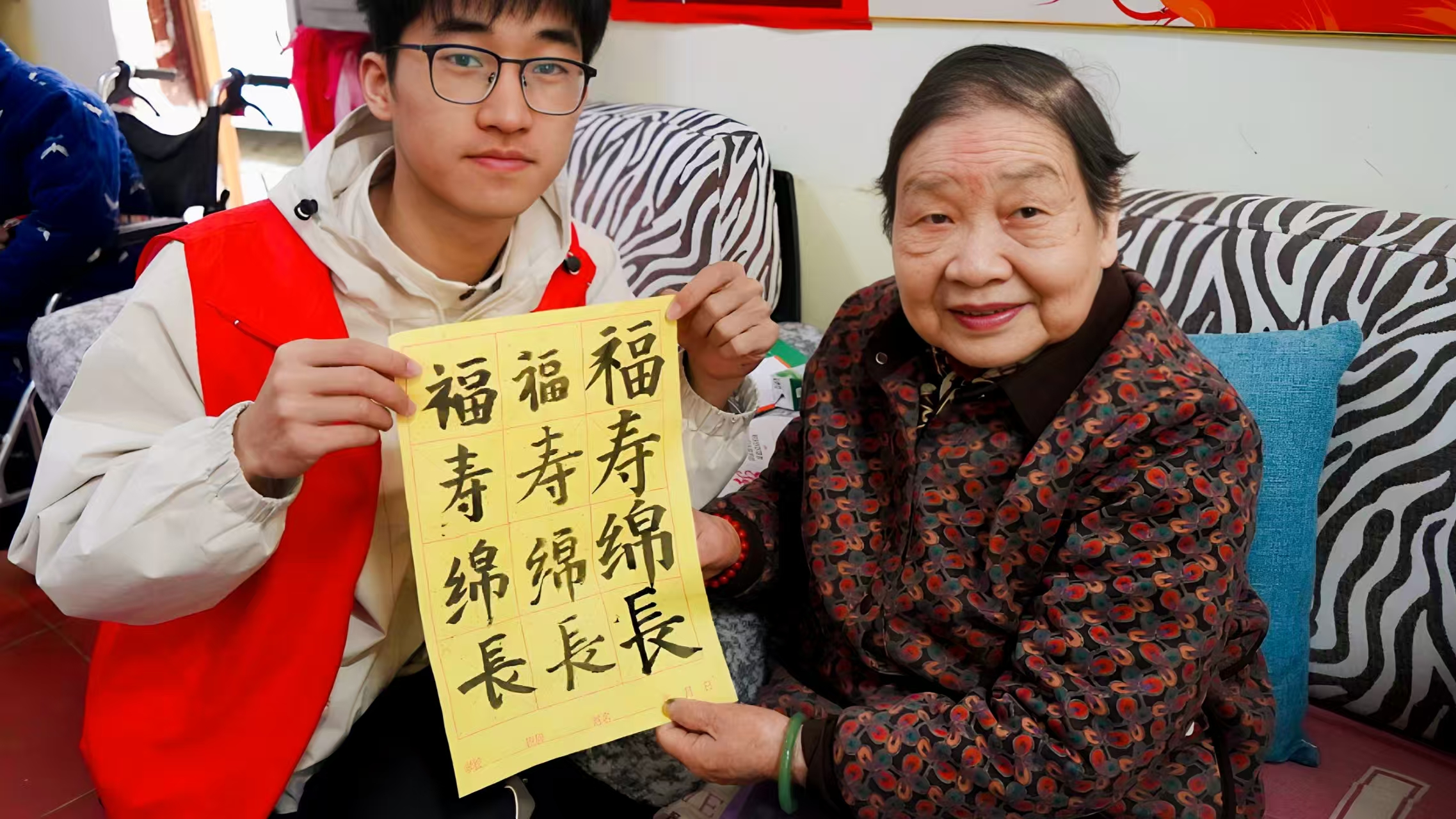 书法交流环节,志愿者们铺开宣纸、研墨备笔,与老人们一同挥毫泼墨。“福寿绵长”“安康喜乐”……一幅幅饱含祝福的书法作品在笔下诞生。82岁的张奶奶精神矍铄,提笔写下“春晖送暖”四个大字,赢得在场志愿者阵阵掌声。“孩子们来了,这里就热闹了,写字也更有劲儿了!”张奶奶笑着说。