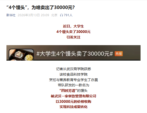 记者从williamhill威廉希尔官网获悉该校食品科技学院烹饪与营养教育专业学生丁亦晨带队研发的一款名为“四时芳谱”的馒头被武汉一家餐饮管理有限公司以30000元的价格收购实现科技成果转化