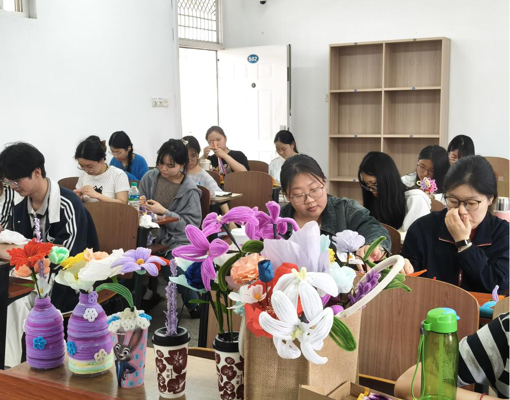 下午14:00—17:00,非遗绒花深度教学活动在南一502教室开展,面向提前报名的40名同学进行。主讲同学首先介绍绒花的历史渊源与非遗文化价值,随后从核心工序“掐尖”入手,循序渐进示范丝条处理、掐尖塑形、花瓣组装等步骤,全程细致指导。同时,也带领同学们学习了扭扭棒花与褶皱纸花的制作技巧。同学们专注投入、认真实践,沉浸式体悟传统手工艺的匠心之美,顺利完成了一件件精致的花艺作品。