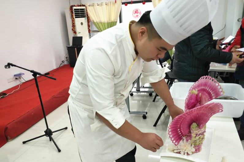 “我从小动手能力就很强,对烹饪技能很感兴趣,大学里就自然而然地选择了烹饪专业。”冯松说。入校后,他凭借着自己的热情和天赋,雕水果、做荤菜、捏面点、装摆盘,在学生中脱颖而出,得到校方青睐与师生的认可。每一项烹饪专业技能他都尽全力做好、做精。