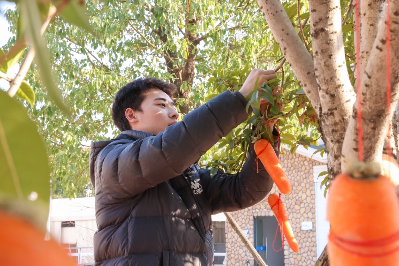 系着红发带,身着赤色鞍,一匹匹马儿在师生的精心打扮下出现在眼前,它们前往挂满苹果和胡萝卜的礼物树,凭借自己的努力在树上“寻宝”,收获自己的新春佳肴。体育学院·国际马术学院教师胡智桐介绍:“苹果寓意平安顺遂,‘福’萝卜则寓意着福气满满。这些都是马儿比较喜欢的食物,在新春佳节,希望通过这种方式祝福同学们和所有马儿平平安安,事事顺心。”