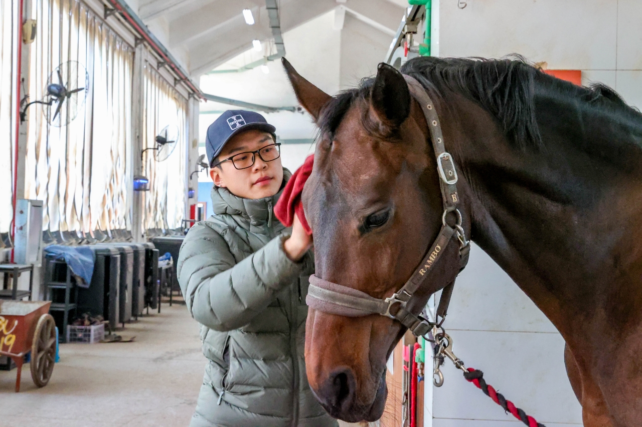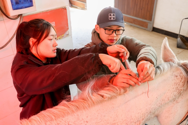 “今年是武汉的小年,我们起了个大早,要把我们的老伙计们打扮得漂漂亮亮。”陈宇琦先用毛刷将马儿的身上仔仔细细擦拭一遍,再将鬃毛捋顺,最后用红丝绳编织成麻花辫。“他们都是我们日夜陪伴和奋战在赛场上的伙伴,过年我们希望和他们一起迎接新春。”在同学们的精细打扮下,一匹匹马儿被打扮成了一个个充满年味的“福宝”。陈宇琦来自贵州,所学专业是马业科学,假期里他主动申请留校照顾马匹,与马儿共度新春佳节。